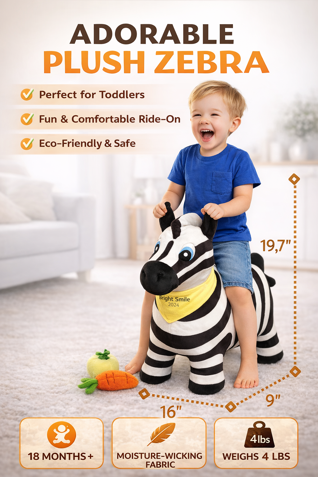 Inside the zebra is a carefully designed inflatable core that provides stability and gentle bouncing, while the outside is wrapped in a luxuriously soft plush fabric that little hands love to touch. It’s perfectly sized for toddlers and ideal for safe indoor play.