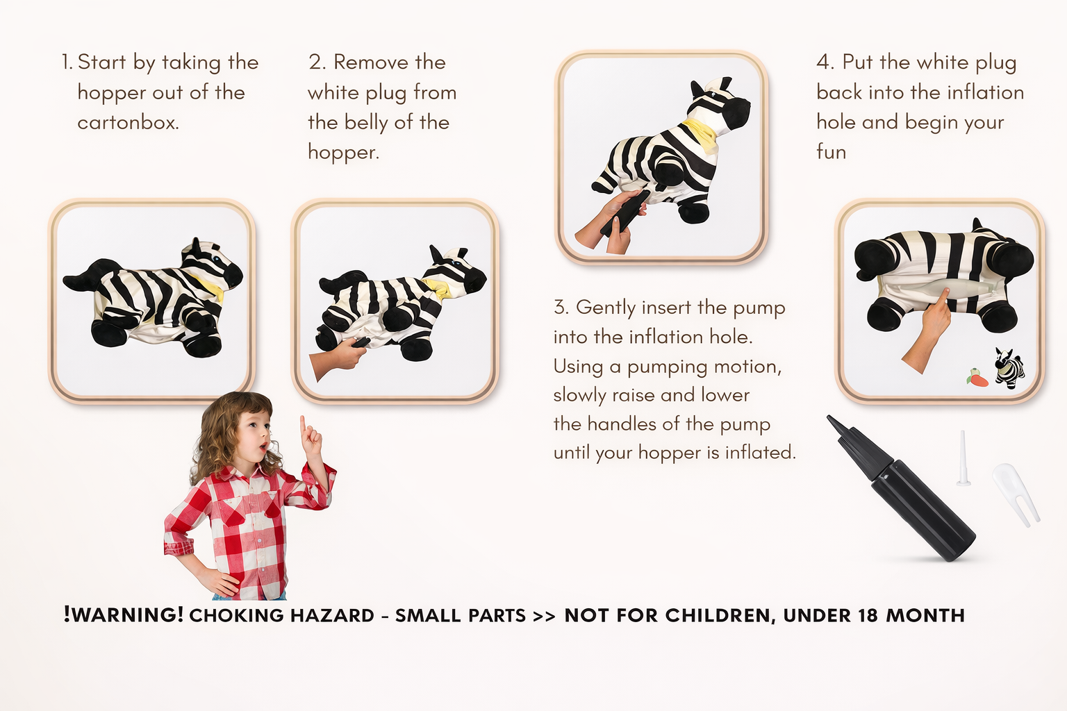 This adorable inflatable plush zebra is designed to become your child’s very first animal friend — one they can ride, hug, name, and remember. With its soft plush cover, gentle bounce, and charming accessories, it turns everyday playtime into moments full of laughter, movement, and imagination.